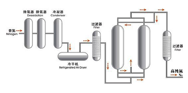 氮?dú)饧兓b置是以變壓吸附制得的粗氮為原料,經(jīng)加氫催化除氧,冷凝水吸附兩級干燥除塵,去除氮?dú)庵械难酢⑺蛪m埃等雜質(zhì),從而獲得高純度的氮?dú)狻F淙丝诘拇值兌纫?ge;98%,出口精氮的純度≥99.999%,氧含量≤3μm,露點(diǎn)≤-65℃。
